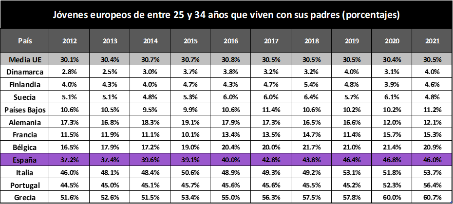 Este es un aspecto especialmente significativo en el contexto económico en el que nos encontramos en España. A raíz del periodo inflacionario y la subida del precio de la vivienda, aun con el tope del 2% al alquiler, se estima que el precio de la vivienda se situó sobre el 11,43€ el metro cuadrado. Esto supone que un inmueble de 80m2 puede costar, de media nacional, unos 914,40€ mensuales. En otras palabras, se estima que, para costearse el alquiler, los jóvenes deban destinar prácticamente el 70% de sus ingresos en la renta. Este es uno de los motivos por los que España se encuentra en la cola de emancipación juvenil en toda Europa, detrás de Grecia, Portugal e Italia.