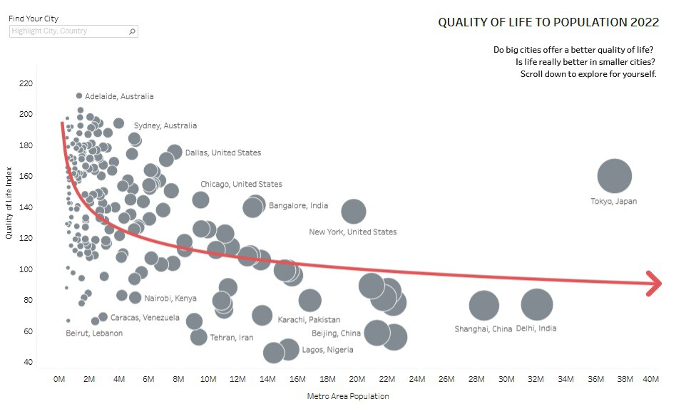 Los estudios parecen sugerir que, cuanto más densa es una ciudad, menor es su calidad de vida, según las métricas mencionadas anteriormente. Aquí podéis consultarlo y en este enlace, podéis calcularlo vosotros mismos. Esto parece suceder en áreas con más de 2.4 millones de habitantes, donde se concluye que la gente está más estresada e insatisfecha. Se valora que la administración pública y su eficiencia, el transporte púbico, las instalaciones culturales, los espacios verdes, la calidad del aire o la confianza entre las personas son factores que influyen decisivamente en la calidad de vida en las grandes ciudades. Obviamente, se observa una clara excepción: la ciudad de Tokio, en Japón, donde sus cerca de 38 millones de habitantes parecen disfrutar de una gran calidad de vida.