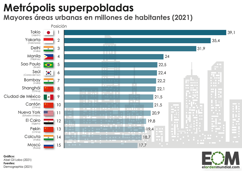 Se estima que, en 2050, aproximadamente un 80% de la población mundial se concentrará en los continentes de África y Asia. Países como la India, Nigeria, Pakistán, la República Democrática del Congo o Etiopía verán un crecimiento exponencial de su población en las próximas décadas. De este modo, el ranquin de ciudades más pobladas será encabezado por Nueva Delhi, Tokio, Shanghái, Dhaka y El Cario.